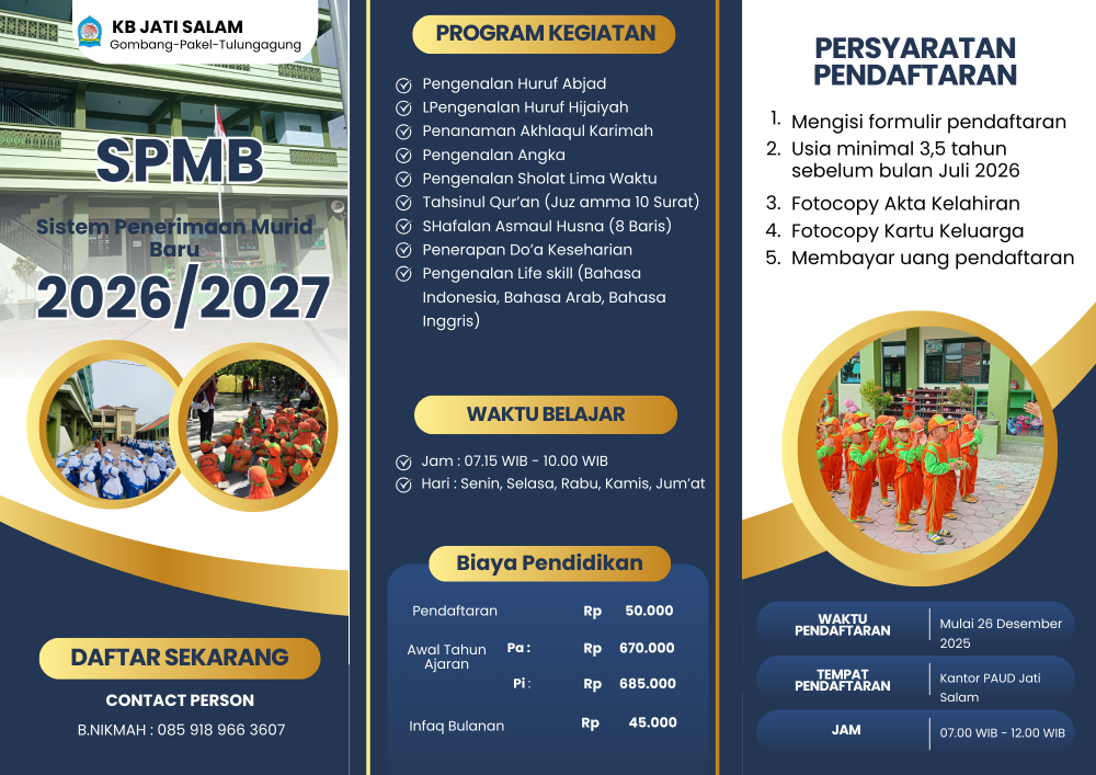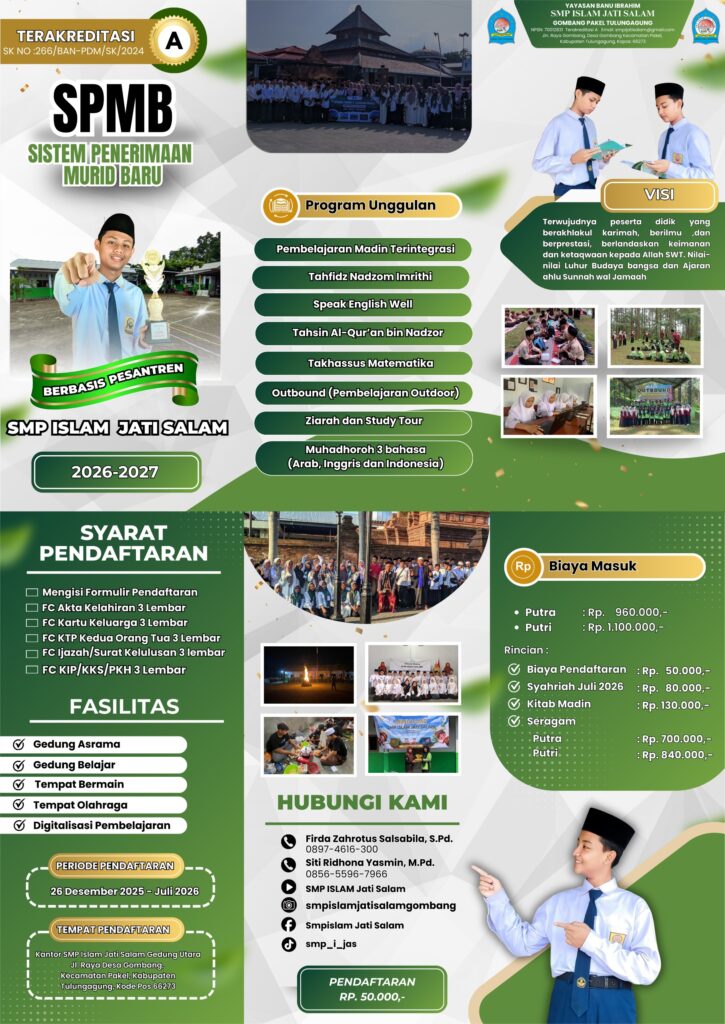 SPMB (Sistem Penerimaan Siswa Baru) Lembaga Pendidikan Islam Jati Salam dimulai pada tanggal 26 Desember 2025. Untuk Memudahkan Konsultasi dan Pendaftaran Silahkan menggunakan aplikasi Whatsapp