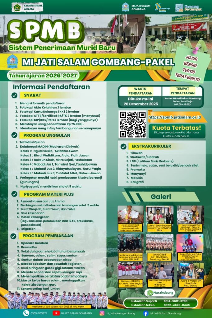 SPMB (Sistem Penerimaan Siswa Baru) Lembaga Pendidikan Islam Jati Salam dimulai pada tanggal 26 Desember 2025. Untuk Memudahkan Konsultasi dan Pendaftaran Silahkan menggunakan aplikasi Whatsapp